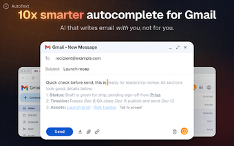 นอกจากการเติมข้อความแล้ว AutoText ยังทำให้การจัดรูปแบบและเลย์เอาต์เป็นอัตโนมัติ ช่วยให้ผู้ใช้รักษาลักษณะอีเมลที่สะอาดและเป็นระเบียบ ส่วนเสริมนี้อ้างอิงข้อมูลจากอีเมลก่อนหน้าอย่างชาญฉลาด เช่น วันที่และชื่อ เพื่อทำให้กระบวนการเขียนราบรื่น แตกต่างจากฟังก์ชันการเติมข้อความอัตโนมัติแบบมาตรฐานของ Gmail AutoText มอบโซลูชันที่แข็งแกร่งกว่าให้กับผู้ใช้ที่ต้องการเพิ่มประสิทธิภาพการทำงานของอีเมลของตน